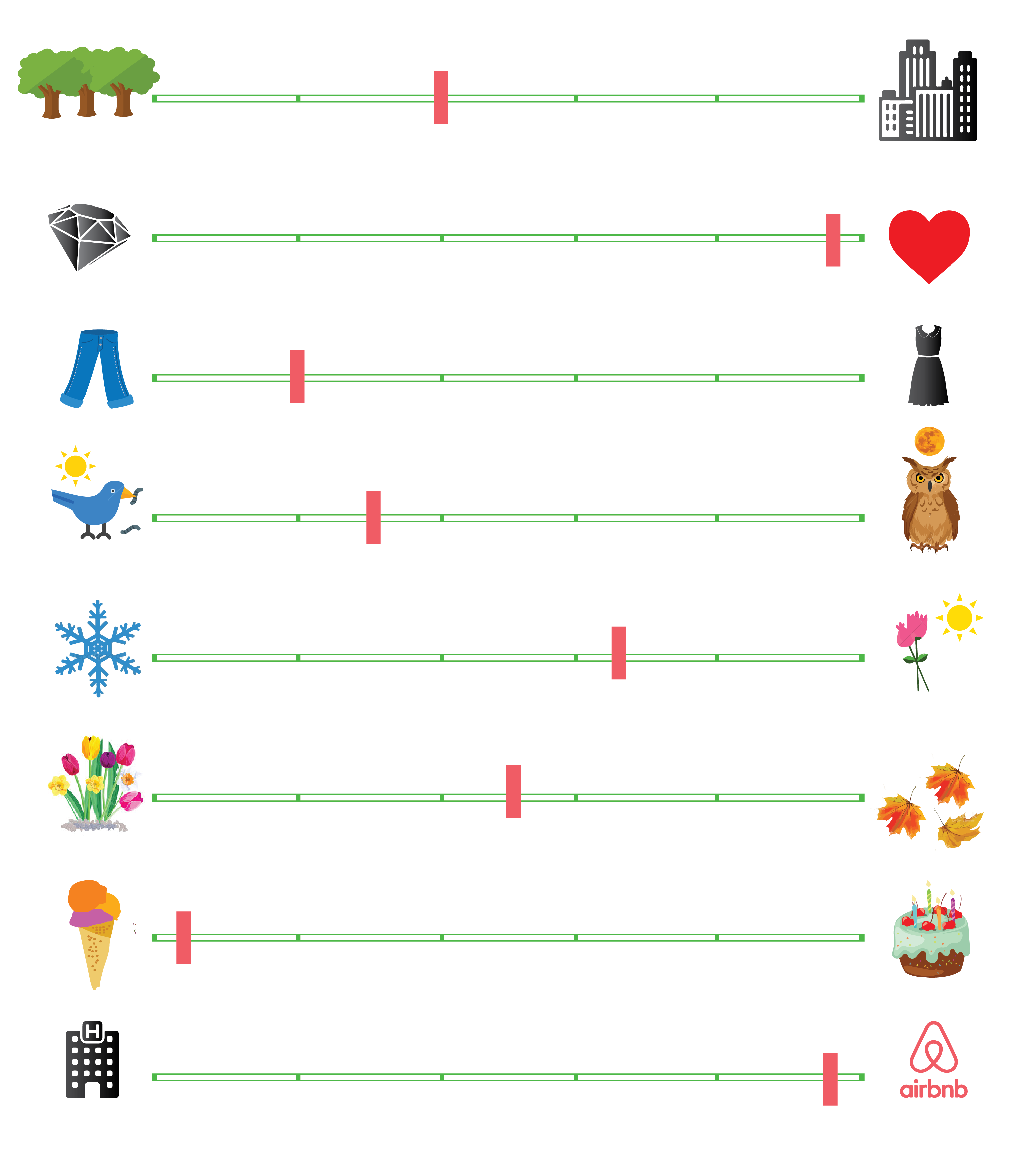 Nature or cities? Gifts or affection? Casual or fancy? Early bird or night owl? Winter or summer? Spring or fall? Ice cream or cake? Hotels or Airbnb?