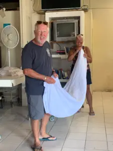 After THREE weeks without laundry facilities, it took about 2.5 – 3 hours to get everyone’s laundry done. But I didn’t mind spending a few hours at the laundromat- it’s not like have any other demands on my time. 🌊☀️🏝