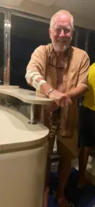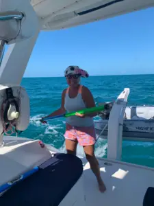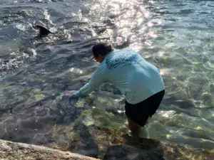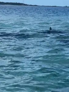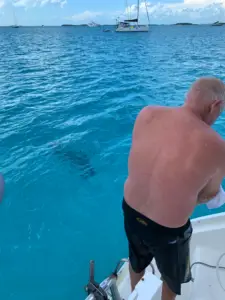 As we were standing outside the yacht club at the marina, we saw a man at the fish cleaning station, quickly and expertly cleaning fish and slicing fillets. As he cut off the scrap, he would toss it in the water, and the nurse sharks would swarm around, eating whatever he dropped. There were more than a dozen nurse sharks of varying sizes moving around. The standard liability sign was posted (insert pic) and we stared down at them in rapt fascination. Nearby, a lady was opening the box on her brand-new shark band. She asked if anyone was familiar with shark bands, and Stu mentioned that he and Bry had a set. She asked if he would take her band down into the water because she wanted to see if it worked. He agreed, and stepped down into the water, extending the band in front of him, directly in front of a nurse shark.