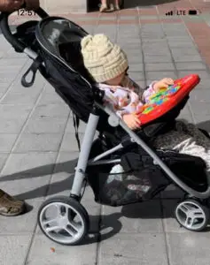 Consider the temperature (see picture), then look at the bundled up child in the stroller. It was 75 degrees, the dad was in shorts (I cropped him out of the photo to focus on the baby) and baby is bundled up with a winter hat? I have so many questions.