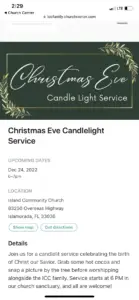 I returned to my hotel room, washed up and headed to Christmas Eve Worship services at Island Community Church, where it was standing room only (I literally stood against the wall at the back of the church.) Christmas Eve worship was different than what I expected; I am used to seeing a reenactment of the Three Wise Men visiting Baby Jesus.